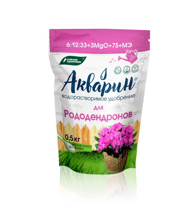 «Акварин» для рододендронов — водорастворимое удобрение, в состав которого входит азот, фосфор, калий, магний, сера и микроэлементы – железо, цинк, марганец, медь в хелатной форме, а бор и молибден – в минеральной. Благодаря кислой реакции (рН) удобрения, оно легко растворяется в холодной воде и более эффективно усваивается корневой системой или листовой поверхностью растений.